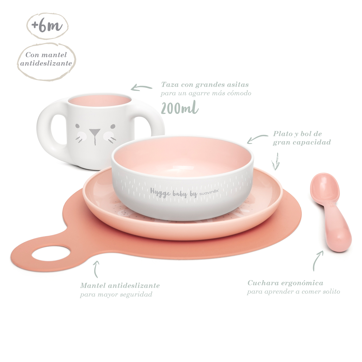 Vajilla compuesta por plato llano y bol de gran capacidad, taza con grandes asitas que facilitan su agarre, cuchara ergonómica ideal para papillas y potitos y mantel antideslizante que evita que el plato se mueva.