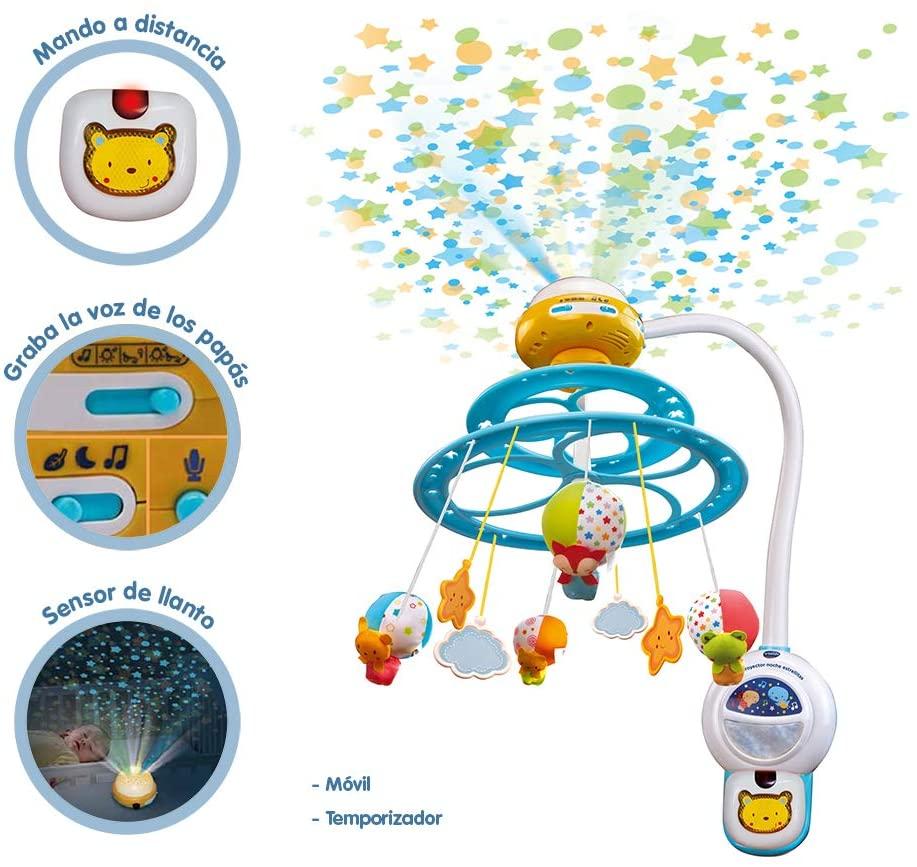 La base de la luz es desmontable y se puede utilizar también como proyector. Incluye un espejo de seguridad y sensor de sonido para activar el juguete con el llanto del bebé.