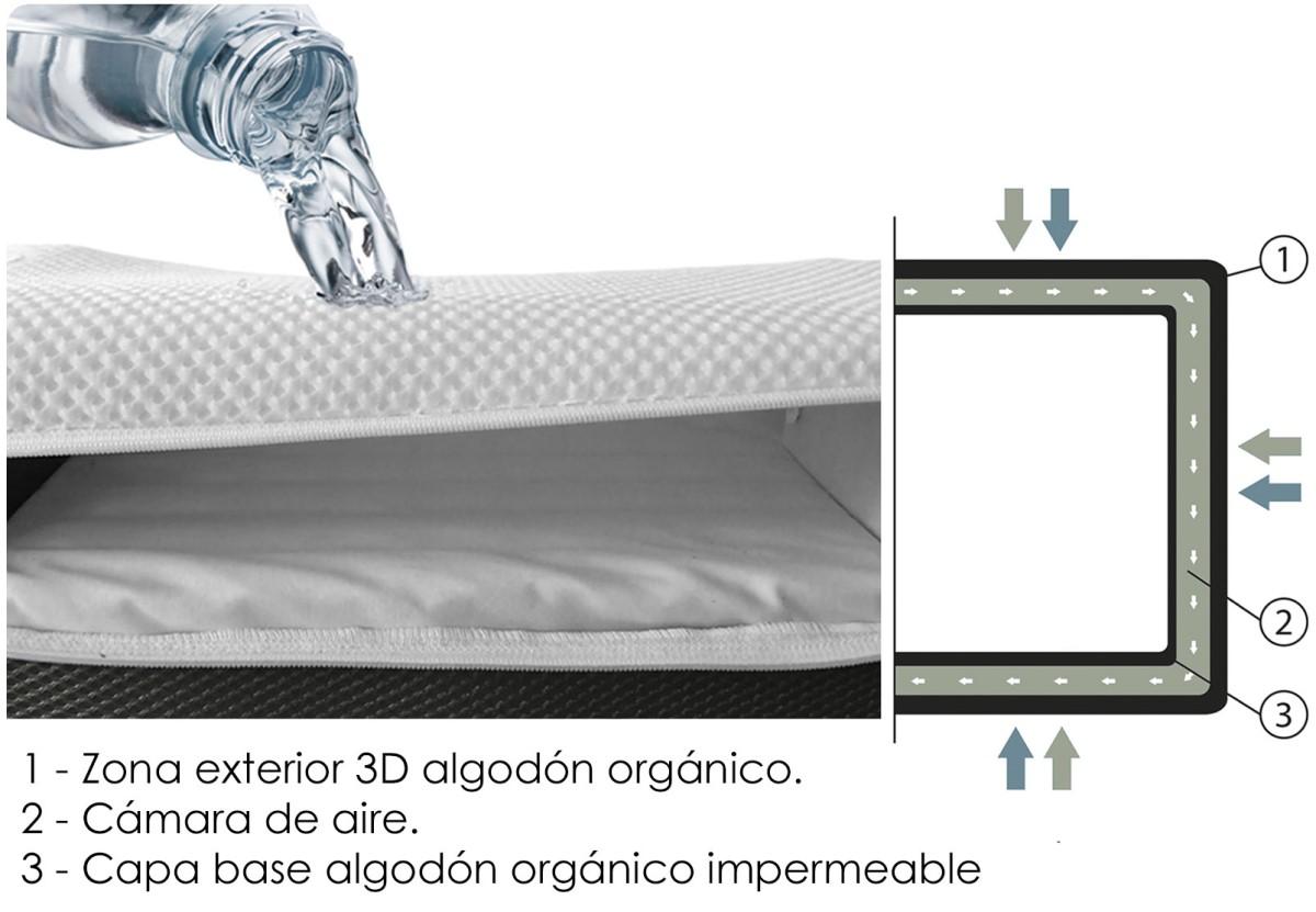 La tapa universal que mayor transpiración da al colchón y que se ajusta a todos las medidas del mercado. Su diseño permite la correcta respiración del bebé boca abajo en el caso de que este se girara, reduciendo el riesgo de asfixia. Permite dormir directamente sobre esta por ser de algodón orgánico.
