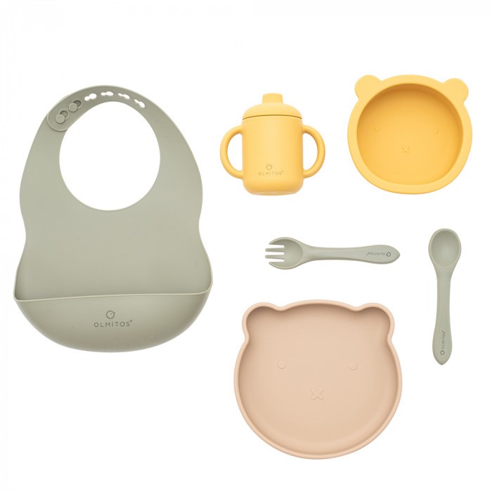- Contiene: Babero, plato, bol, cuchara, tenedor y vaso con boquilla